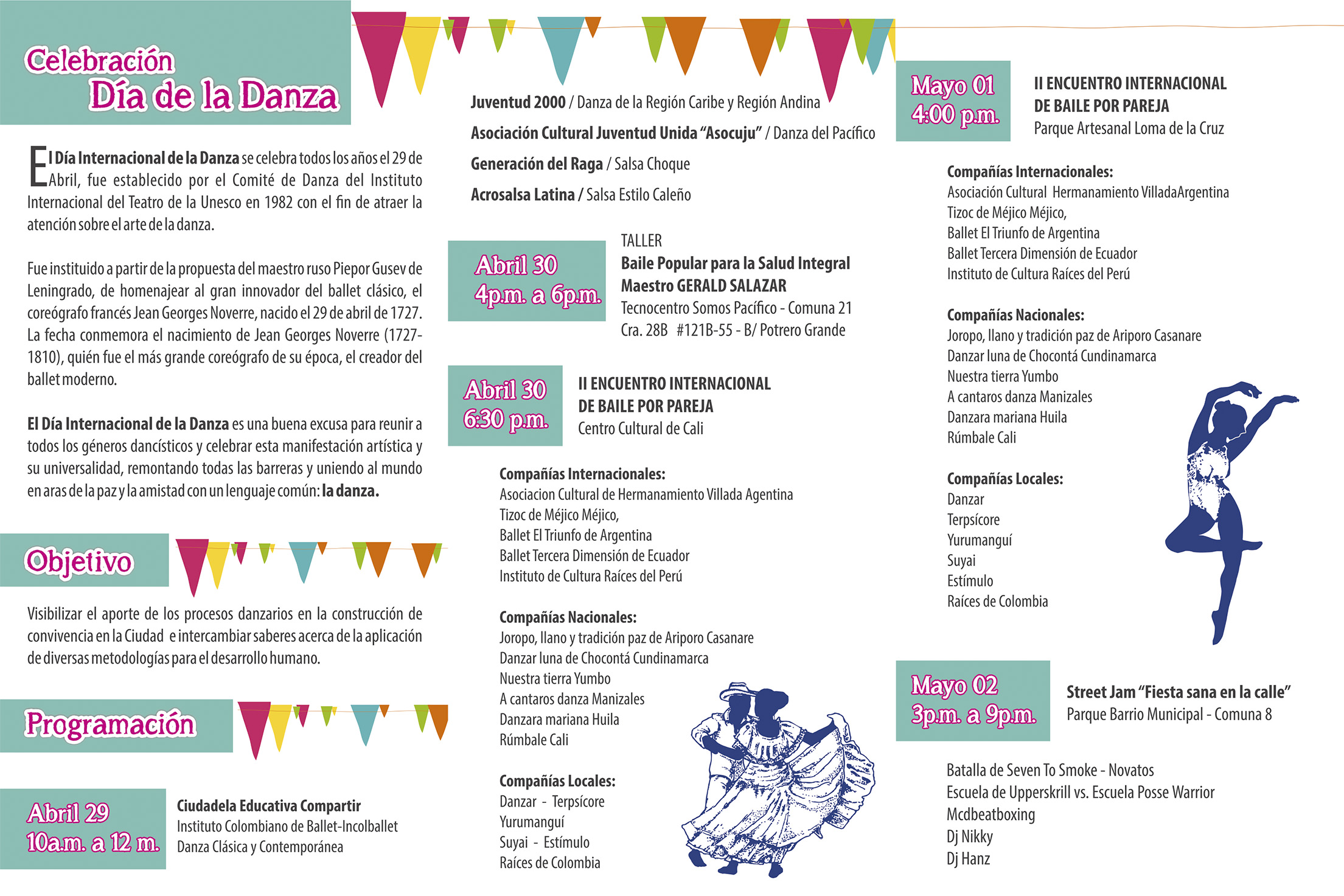 Con muestras de danza clásica y folclórica de las regiones Caribe, Andina y Pacífico, así como salsa caleña y salsa choque, la Secretaría de Cultura y Turismo y el Ministerio de Cultura celebrarán el Día Internacional de la Danza.