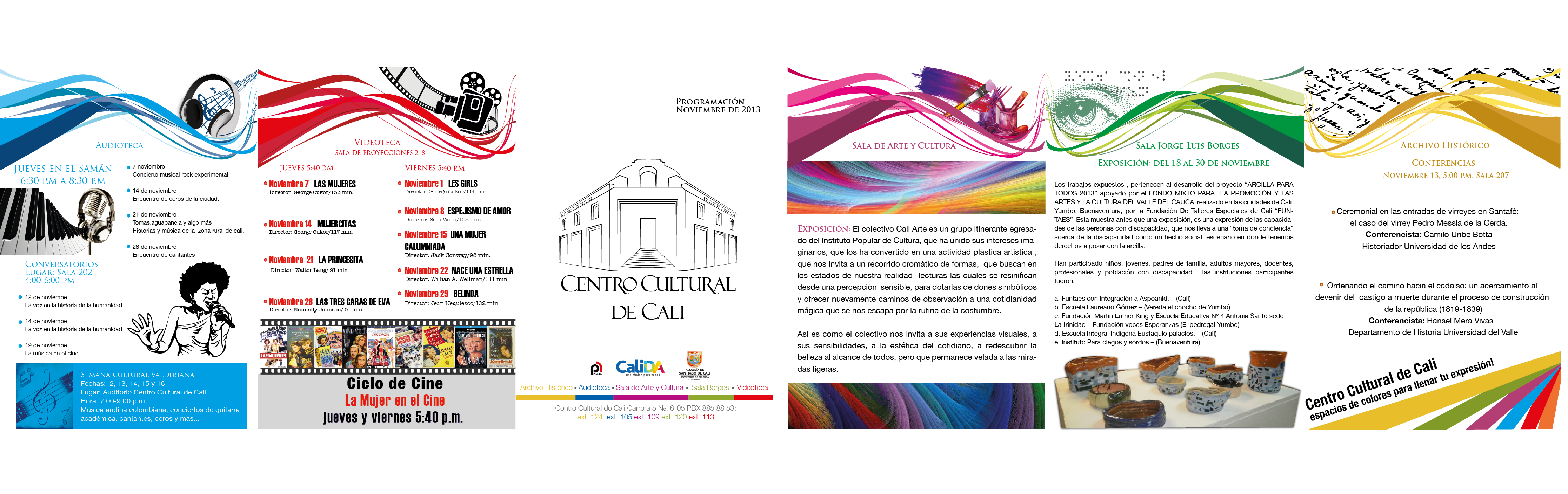 Vive noviembre en el Centro Cultural de Cali, espacio en el cual la Secretaría de Cultura y Turismo del Municipio ha programado una variada programación que incluye proyección de películas, conciertos, conversatorios, conferencias, así como exposiciones para el exigente público caleño y los visitantes nacionales e internacionales que se acercan al Centro Histórico de Cali.
