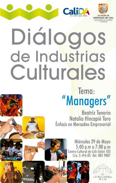 La Secretaría de Cultura y Turismo de Cali, invita a toda la comunidad de artistas y emprendedores a los diálogos de Industrias Culturales, que se vienen realizando en las instalaciones del Centro Cultural de Cali y las cuales tratan temas como: Industria cultural término y contexto, ley de espectáculos, propiedad intelectual, managers, redes sociales, patrocinios, branding cultural, investigación de mercados, estímulos y otro tipo de convocatorias para obtener recursos.