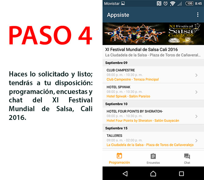 La aplicación está disponible desde ya para que siga paso a paso todos los pormenores de este magnífico Mundial de Salsa. Por otra parte Cotelco, con todos sus hoteles afiliados en Colombia, estarán pasando la promoción del Festival en cada reunión que se realice del 1º al 15 de septiembre.