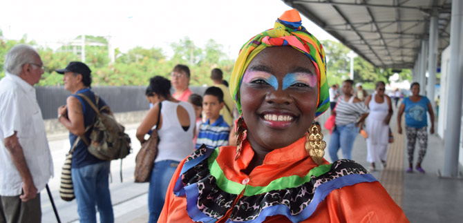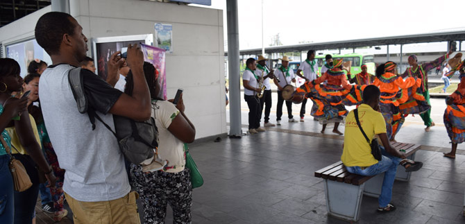 Los usuarios del Sistema Integrado de Transporte Masivo que se movilizaban por la Estación de Andrés Sanín, fueron recibidos con una muestra del folclor del litoral Pacífico, en la antesala del XXII Encuentro Nacional e Internacional de Danzas Folclóricas ‘Mercedes Montaño’, organizado por la Secretaría de Cultura y Turismo de Cali.