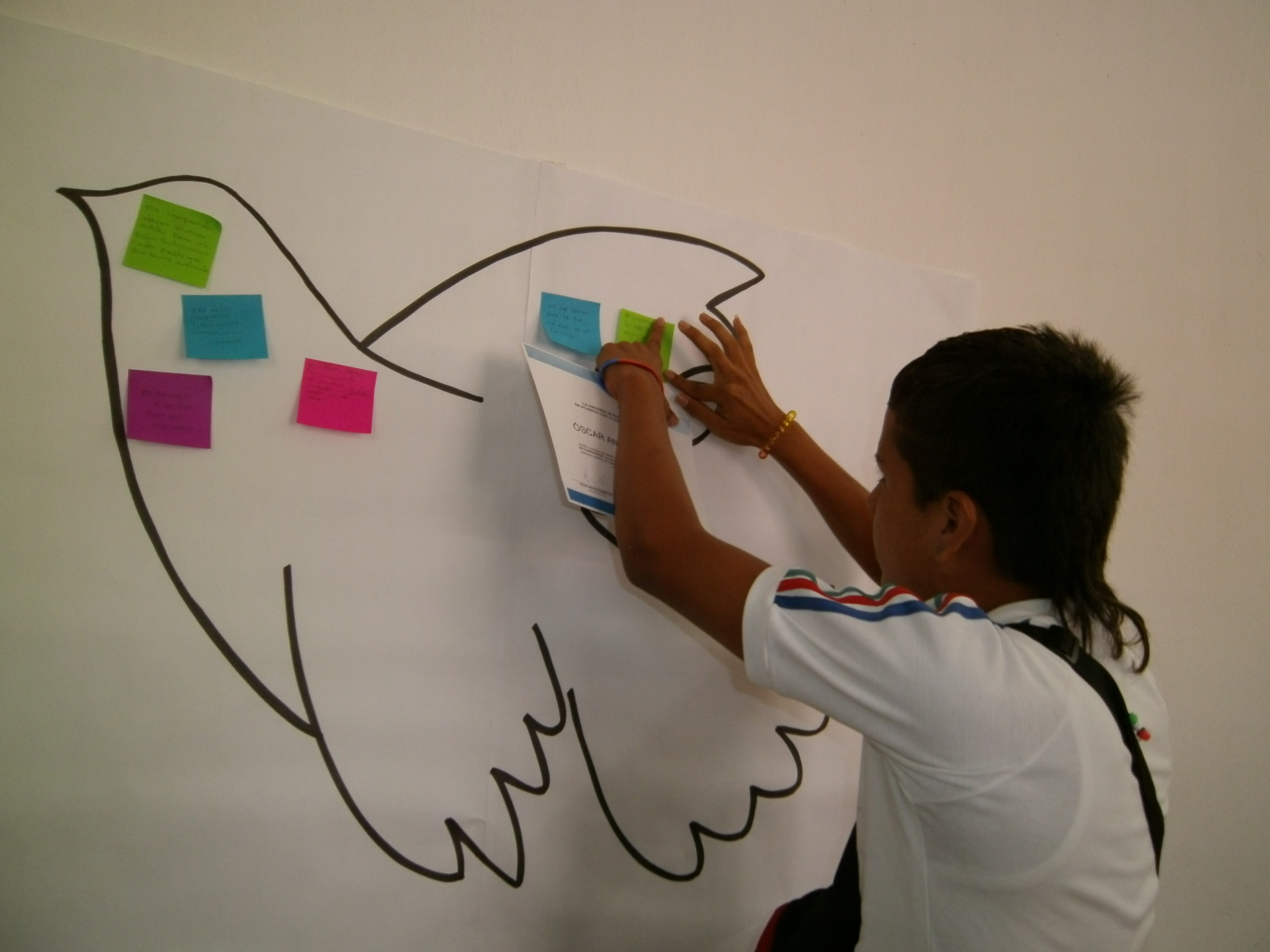 Durante la entrega de los certificados se realizó un acto simbólico en donde los nuevos facilitadores de paz escribieron sus compromisos y reflexiones para contribuir a la paz y los pegaron en el dibujo de una paloma de la paz.
