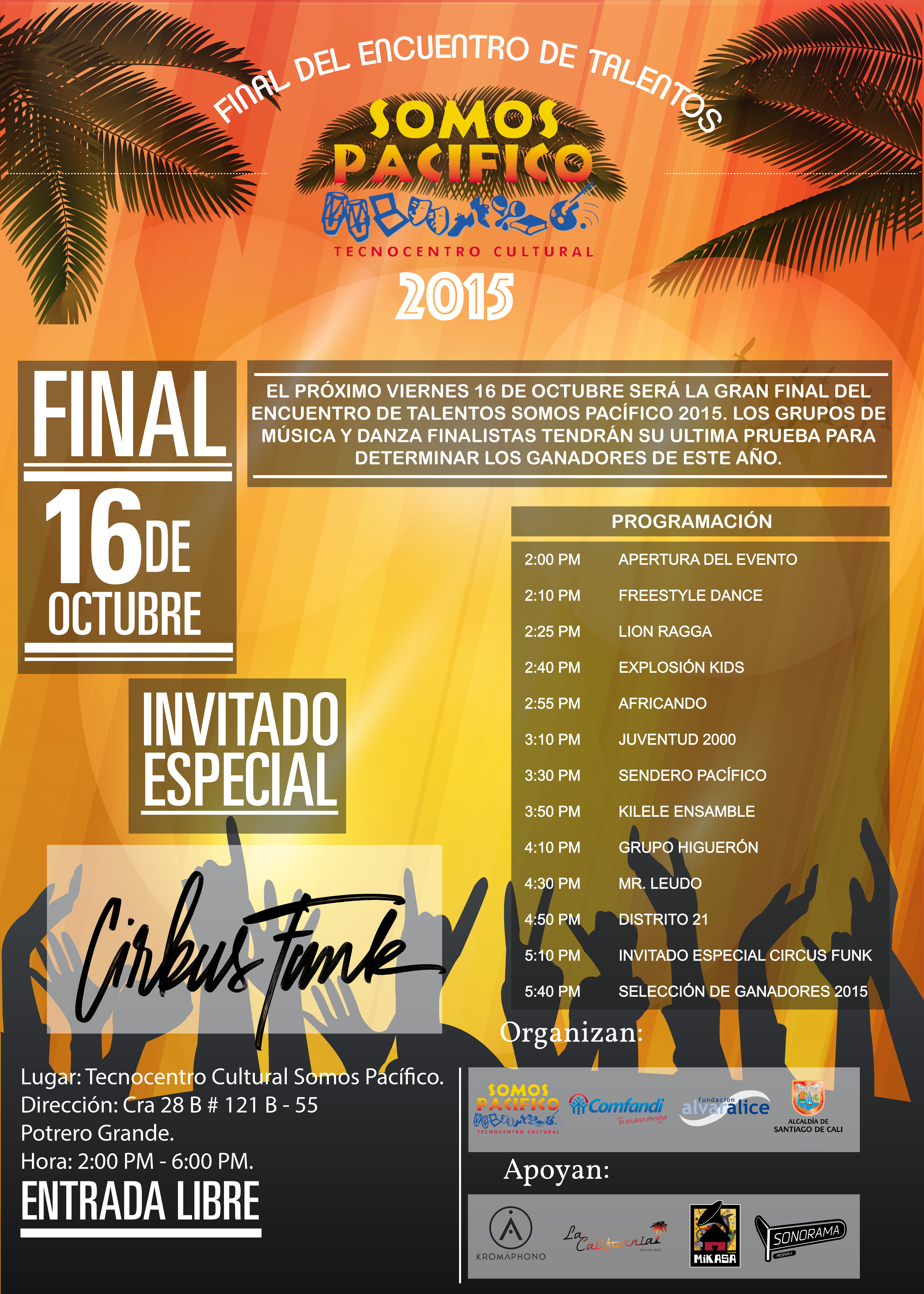 El evento final del Encuentro de Talentos Somos Pacífico 2015 tendrá lugar este viernes 16 de octubre y contará con la participación de los grupos seleccionados en las audiciones además de la participación de invitados especiales como el reconocido grupo caleño Circus Funk.