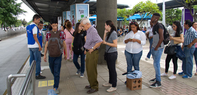 30 jóvenes de Siloé, estudiantes del colegio Eustaquio Palacios, cada semana tienen el reto de enseñar Cultura Ciudadana a los usuarios del MIO de la Estación Deportiva de Cali, para humanizar el espacio público y transformar el comportamiento de los ciudadanos, por uno que incentive el civismo y promueva el respeto.