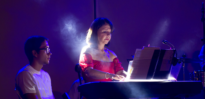 Carmen González, Directora del Teatro Los Cristales no ocultó su emoción al interpretar varias de las canciones con la agrupación Baracutey como la voz principal de esta orquesta de son cubano.