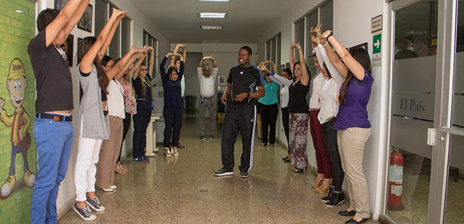 Muy temprano en la mañana, periodistas y personal administrativo de El País, Telepacífico, Q´Hubo y el noticiero 90 Minutos, se iniciaron en Pausa Activa, programa entregado por la Secretaría del Deporte y Recreación Municipal, que busca llevar el mínimo vital del deporte a todos los rincones de Cali y minimizar el sedentarismo laboral.