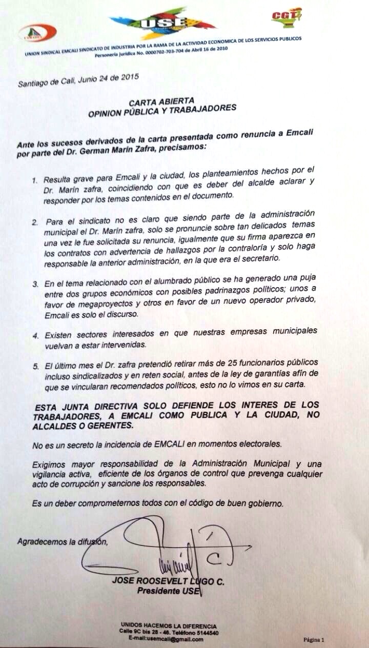 A través de un comunicado, la USE mostró su descontento por los términos empleados por el saliente gerente de Emcali para presentar su renuncia y explicó que para el “sindicato no es claro que siendo parte de la Administración Municipal, el Dr. Marín Zafra solo se pronuncie sobre tan delicados temas una vez le fue solicitada su renuncia.