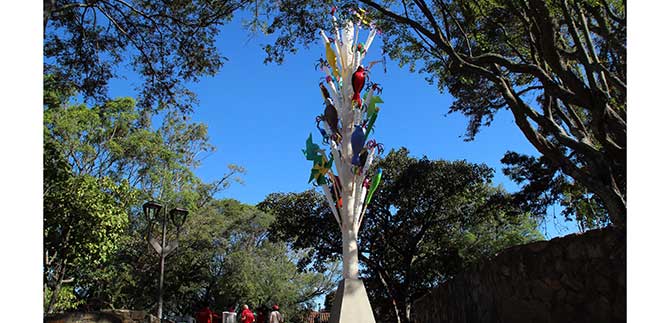 Esta escultura, que representa para muchos, un árbol de dulce ramas donde se anidan los sueños, contiene además sus tradicionales ringletes y entorchados dispuestos en espiral. Indicó que está elaborada en resina de poliéster, fibra de vidrio, metal, concreto, decorada en puntura de poliuretano.