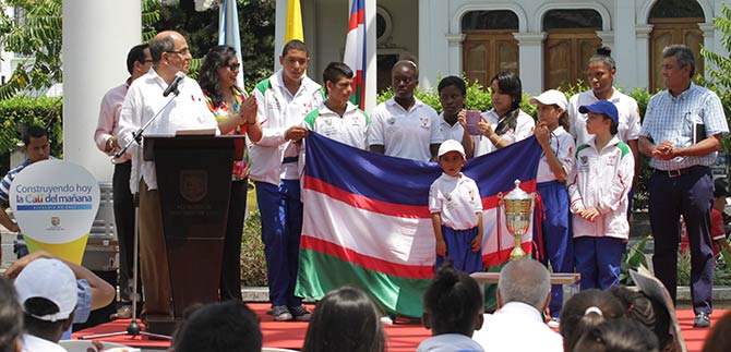 “Es una delegación que desde hace cerca de dos años viene trabajando y  que en un 80 % participa por primera vez representando los colores de su ciudad natal, por lo que se tienen que sentir muy orgullosos y saber que Cali los acoge y los apoya”, manifestó el mandatario.