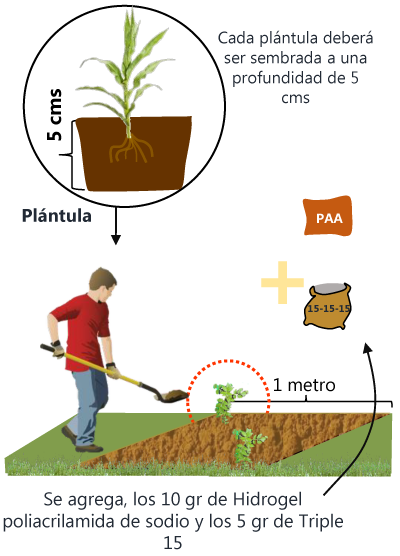 Siembra directa con semilla: La semillas de maíz, al igual que las de cilantro se siembran directamente sobre el terreno previamente preparado. Se siembre las plántulas en dos esquinas opuestas de la huerta y se agrega, los 10 grs de Hidrogel poliacrilamida de sodio, los 5grs de triple 15 y finalmente más tierra.