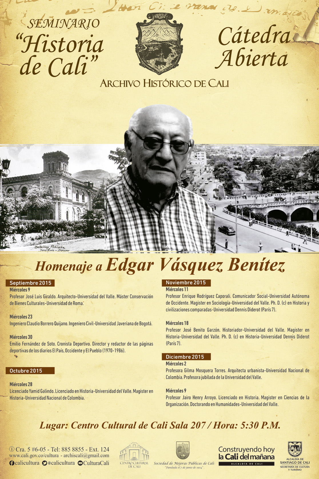 Este seminario es organizado por el Archivo Histórico de Cali en su espacio Seminario Historia de Cali rinde homenaje al profesor Édgar Vásquez Benítez, resaltando su vida, obra intelectual y aportes al estudio histórico de la ciudad.