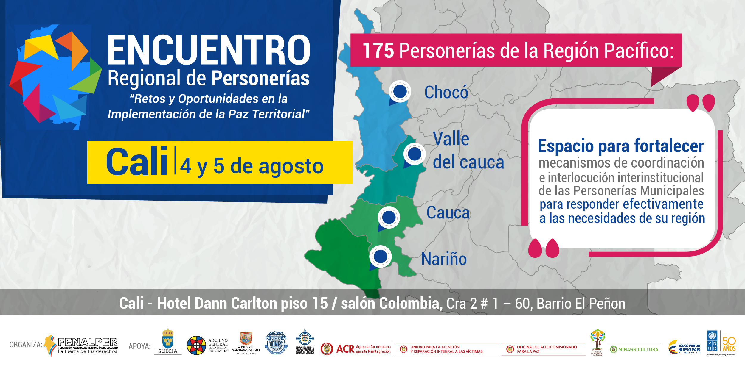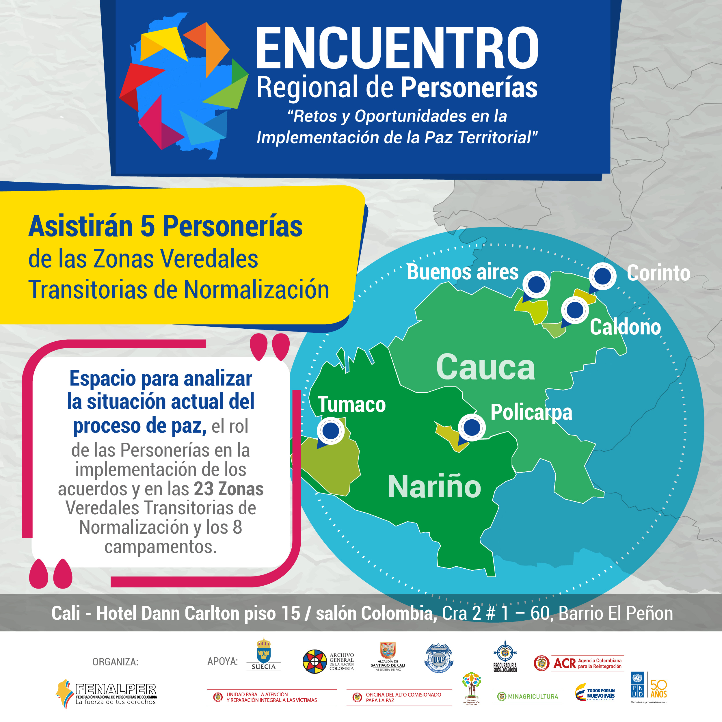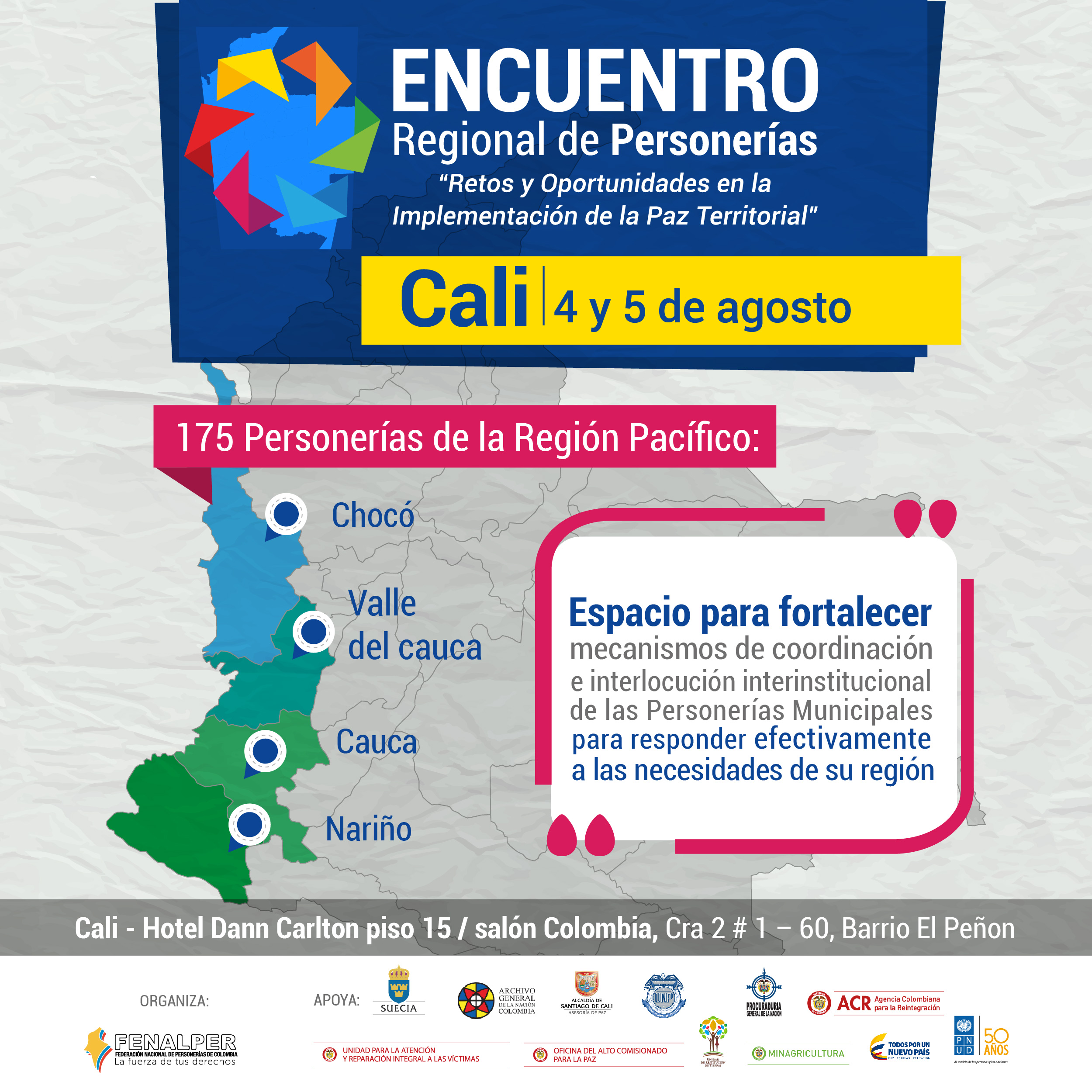 Al primer Encuentro Regional de Personerías: ‘Retos y Oportunidades de la Implementación de la Paz Territorial’, asistirán las Personerías de Chocó, Valle del Cauca, Cauca y Nariño, y se presentará un libro con 48 propuestas para la implementación de la paz territorial.