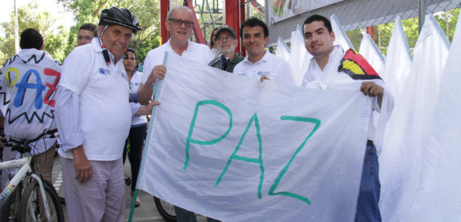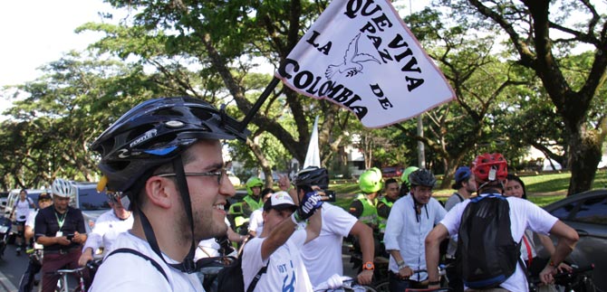 Cientos de estudiantes universitarios de Cali pedalearon por la paz. La convocatoria, iniciativa de los jóvenes, tenía como objetivo promover el uso de la bicicleta y respaldar el proceso de paz.