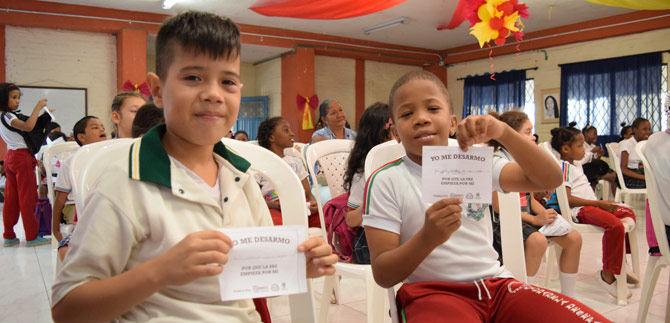 Por ejemplo, Alejandro Caicedo, del Grado Quinto, se desarmó de la desobediencia. “Para mí la paz es algo que los niños debemos aportar en la vida cotidiana, y se logra con esfuerzo y dedicación, nos lo enseñan en la casa y en los colegios. Nos ayuda a ser una persona mejor en el futuro. Hoy me desarmé de la desobediencia”.