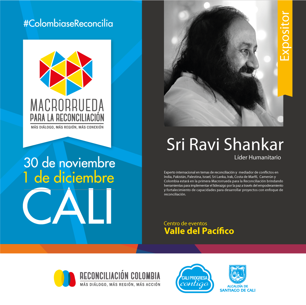 Hacia las 9:30am el reconocido gurú mundial de la reconciliación, Sri Sri Ravi Shankar, se encargará de abrir la agenda académica. Sri Sri, de origen hindú, es un líder humanitario y espiritual, creador de la Fundación El Arte de Vivir, quien por primera vez llega a la capital vallecaucana para compartir su experiencia humanitaria en diversos países en conflicto, entre ellos, Pakistán, Irak, Camerún, Palestina y Colombia. Sri Sri ofrecerá a los medios de comunicación una rueda de prensa, hacia las 11:00am.