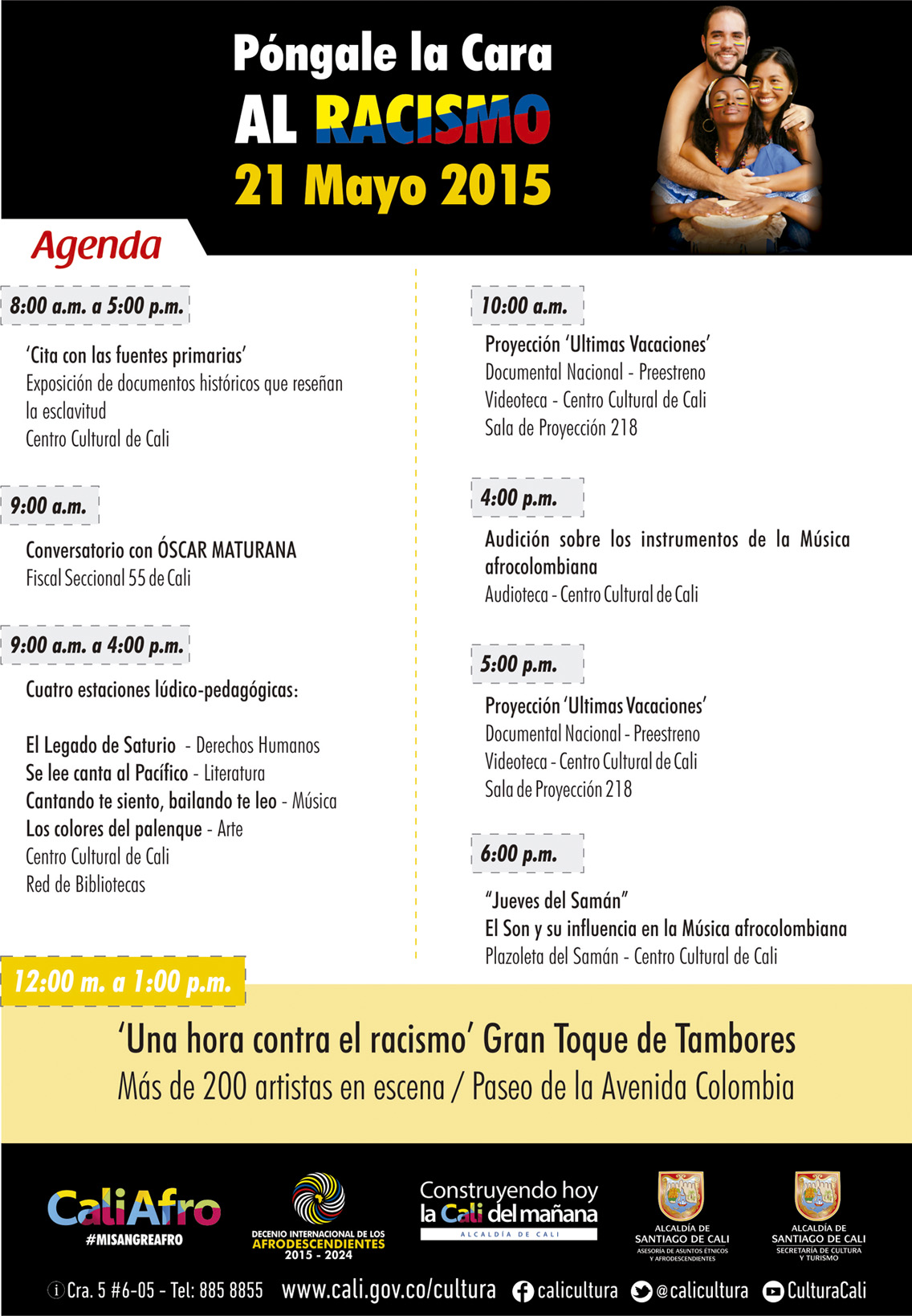 En el marco del Día de la Afrocolombianidad, una completa programación prepara la Administración Municipal a través de las secretarías de Cultura y Turismo; de Bienestar Social y Desarrollo Territorial y la Asesoría de Asuntos Étnicos y Afrodescendientes, para este jueves 21 de mayo.