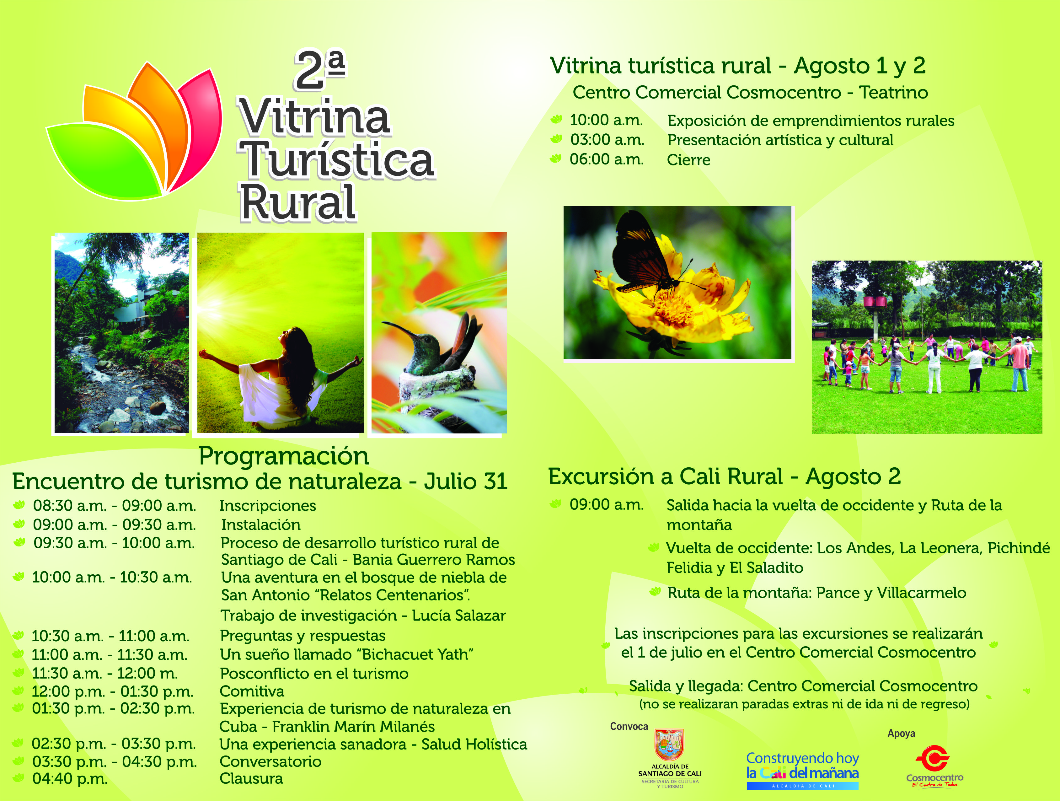Cali dará a conocer a sus habitantes y visitantes nacionales e internacionales su oferta turística rural del 31 de julio al 2 de agosto de 2015 por medio del II Encuentro de Turismo de Naturaleza y II Vitrina de Turismo de Rural.