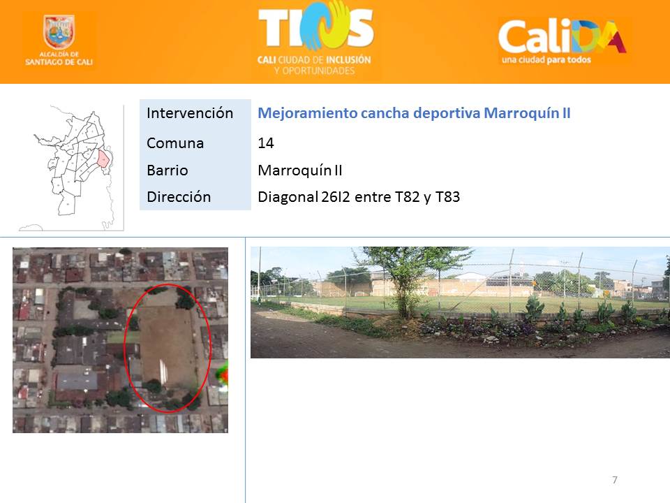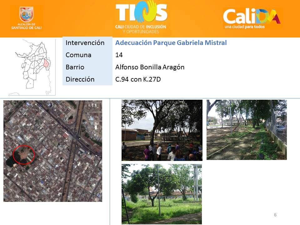 El mejoramiento locativo del polideportivo Las Orquídeas y el apoyo para la cooperativa de los jóvenes del mismo barrio; la recuperación ambiental y física del canal Figueroa y la adecuación del parque Gabriela Mistral, ambos en el barrio Alfonso Bonilla Aragón; sumado a la pavimentación de transitadas vías, forman parte del paquete priorizado por la estrategia TIOS.