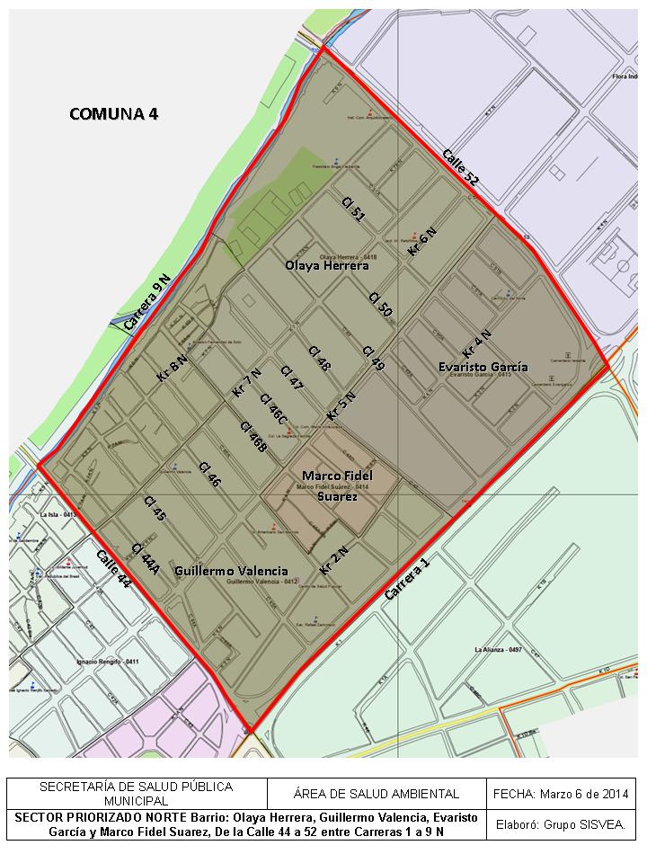 El sector escogido para la jornada está delimitado entre las calles 44 y 52, entre carreras 1ª. y 9N del barrio Marco Fidel Suárez; barrios Evaristo García, Olaya Herrera y Guillermo Valencia, sectores donde se han detectado altos índices larvarios.