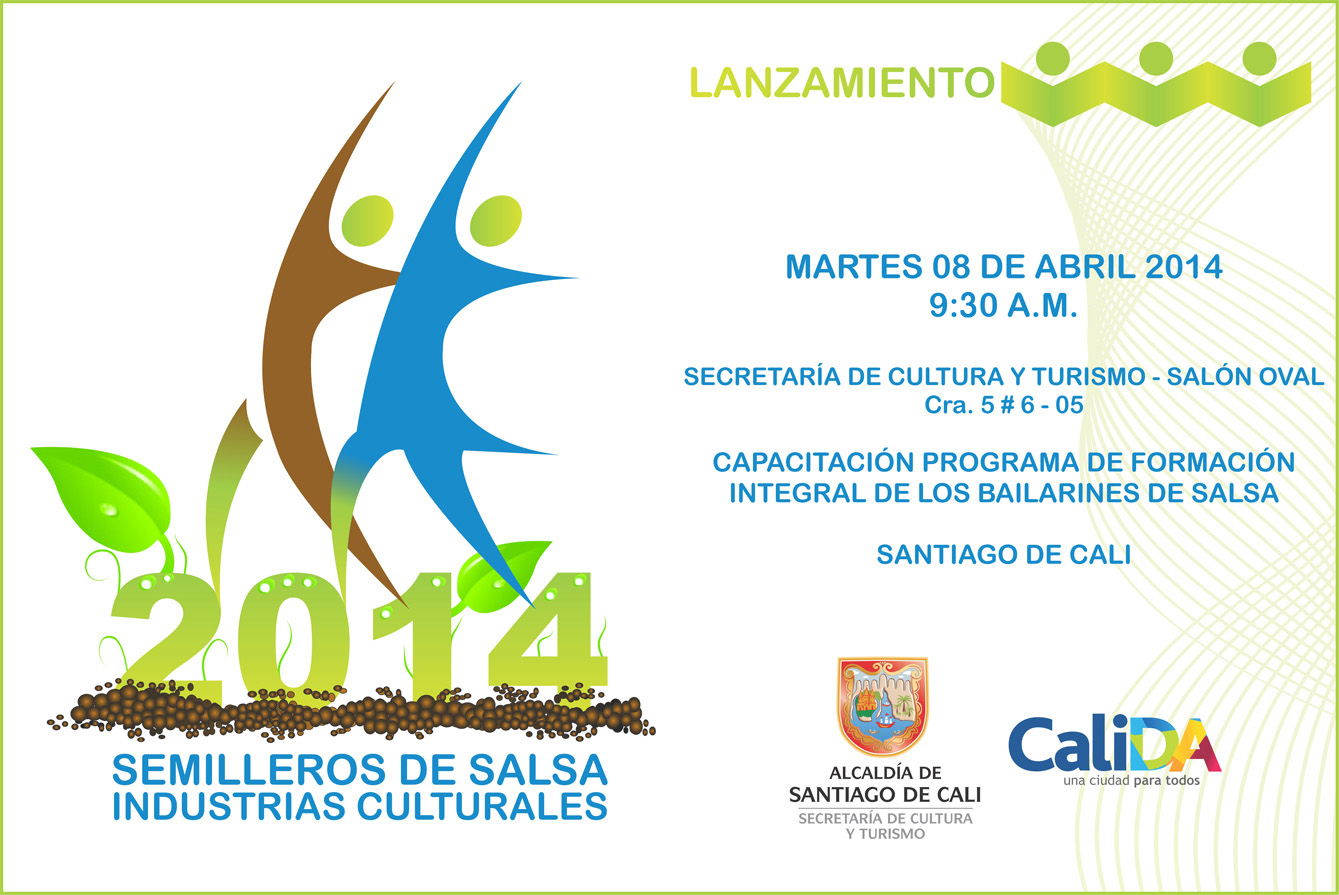 Este martes 8 de abril, con presencia de la secretaria de Cultura y Turismo de Santiago de Cali, María Helena Quiñónez Salcedo, se realizará el lanzamiento del programa de Formación Integral a los Semilleros de Salsa 2014.