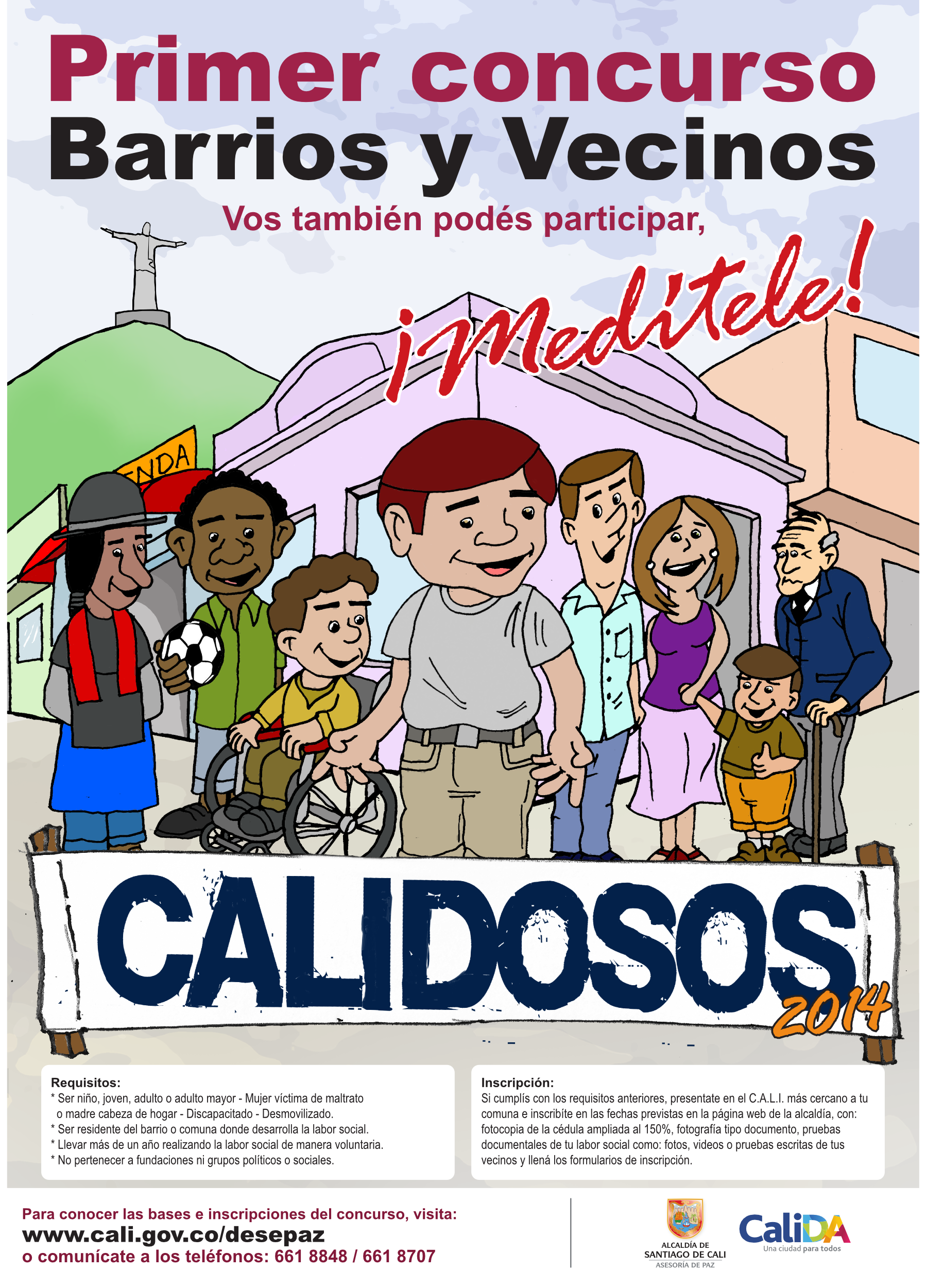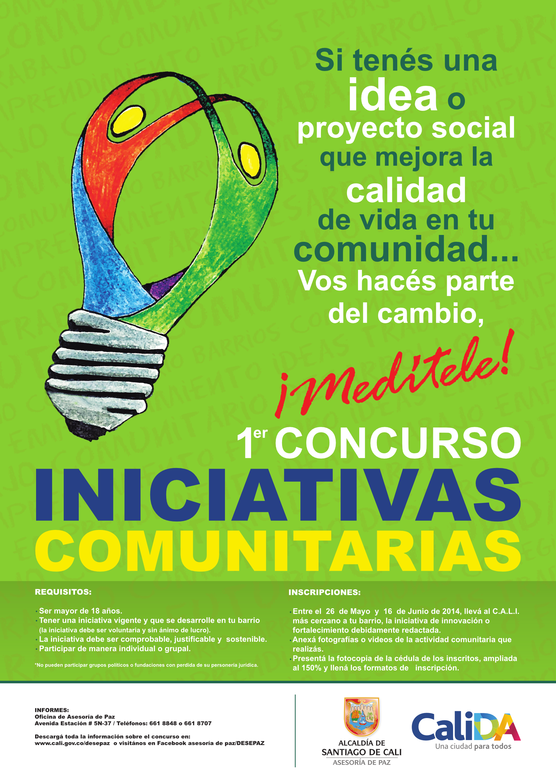 El alcalde de Santiago de Cali, Rodrigo Guerrero Velasco, y el asesor de Paz, Felipe Montoya, convoca para este jueves 22 de mayo a los medios de comunicación, a líderes y organizaciones sociales y a la comunidad en general al lanzamiento de dos concursos, Barrios y Vecinos Calidosos 2014 ‘Medítele vos también podes participar’, e Iniciativas Comunitarias ‘Medítele vos haces parte del cambio’.