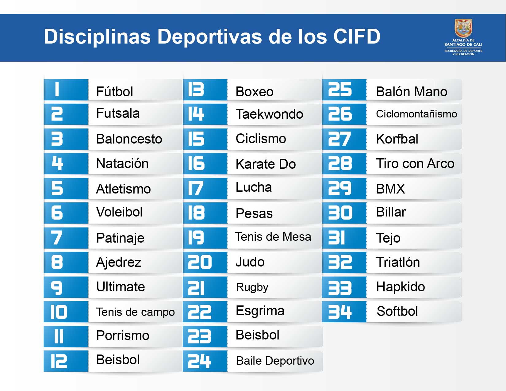 Desde hace nueve años los Centros de Iniciación y Formación Deportiva (CIFD), conforman un programa bandera de la Secretaría de Deporte y Recreación de Cali. Funcionan en las 22 comunas y los 15 corregimientos de la ciudad y ofrecen un promedio de 32 disciplinas. Las más concurridas son fútbol, futsala, baloncesto, natación, atletismo, voleibol y patinaje. Algunos deportes, considerados menos comunes y algo inusuales también son ofrecidos en los CIFD, entre ellos están ultimate, esgrima, billar, tejo, triatlón y tiro con arco.