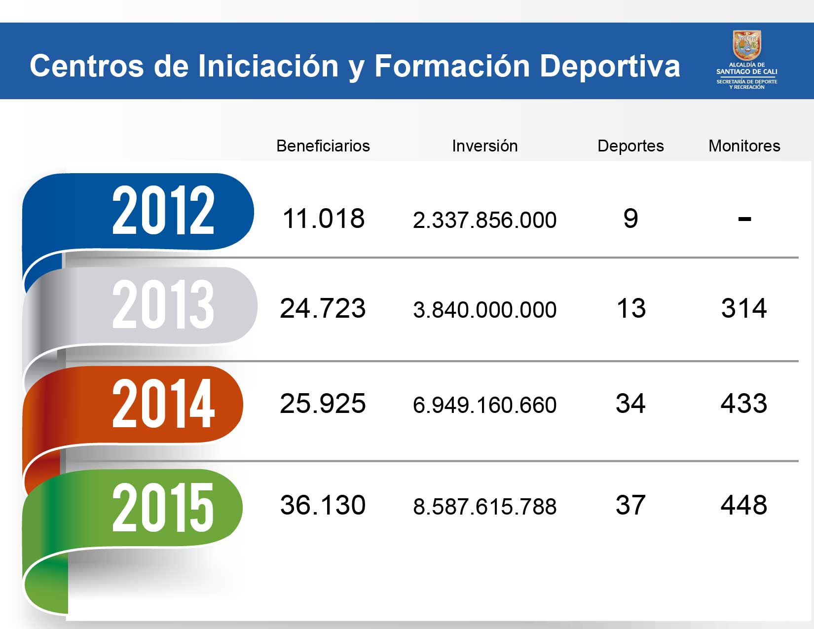 La Secretaría de Deporte y Recreación de Cali, a través de su programa de Centros de Iniciación y Formación Deportiva (CIFD), aporta un espacio gratuito de desarrollo físico para niños a partir de los 5 años. Esta iniciativa, se ha convertido en un alivio para ellas, padres en general y para los 36 mil chicos que en Cali, atienden estas clases.