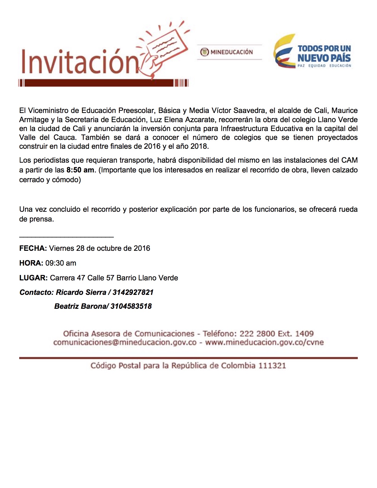 El alcalde de Cali, Maurice Armitage; el Viceministro de Educación Preescolar, Básica y Media, Víctor Saavedra y la Secretaria de Educación Municipal Luz Elena Azcárate, recorrerán la obra del colegio Llano Verde en Cali y anunciarán la inversión conjunta para infraestructura educativa en la capital del Valle.