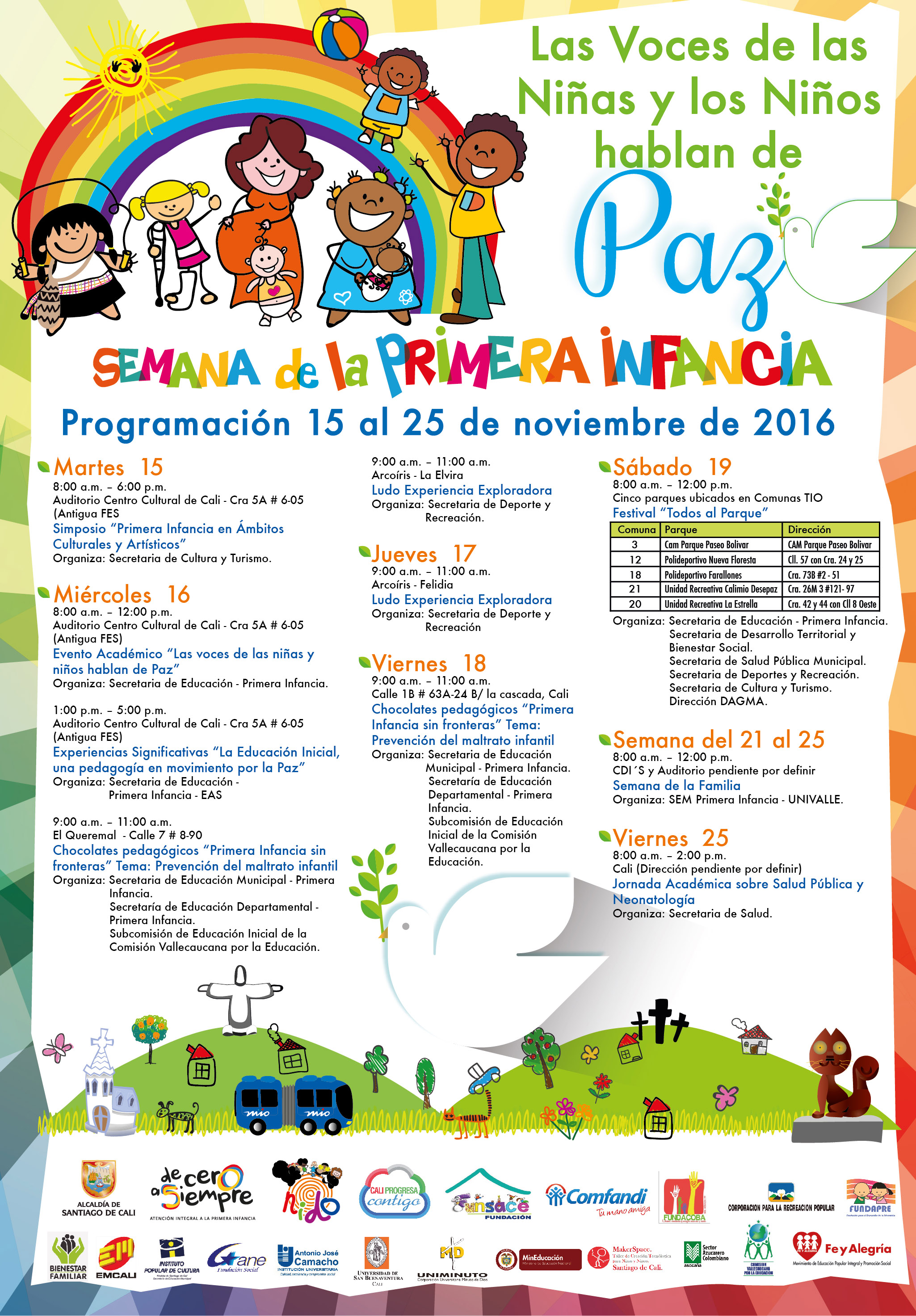 La Alcaldía Santiago de Cali, a través de las Secretarías de Educación- Coordinación Técnica Primera Infancia, Cultura y Turismo, Deportes y Recreación, Bienestar Social, Salud Pública, Departamento Administrativo de Gestión del Medio Ambiente - Dagma, el Comité Intersectorial de Primera Infancia CIPI, la Mesa Municipal de Primera Infancia, la Comisión Vallecaucana por la Educación CVE y la Subcomisión de Educación Inicial, se han unido para celebrar la IV Semana de la Primera Infancia: “Las voces de niñas y niños hablan de Paz” programada del 15 al 25 de noviembre, que se desarrolla en el marco de la conmemoración de la adopción de la Convención de los Derechos del Niño por las Naciones Unidas el 20 de noviembre de 1989.