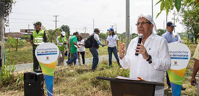 Con la siembra de un árbol y las palabras de bienvenida de un grupo de niñas del colegio Niño Jesús de Atocha, el alcalde de Cali, Rodrigo Guerrero Velasco, dio al servicio de la comunidad 1,5 kilómetros de vías adoquinadas, en la comuna 15.