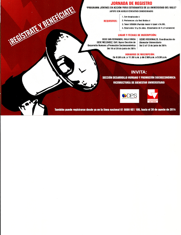 Desde este 16 de junio y hasta el 20 del mismo mes, los estudiantes de la Universidad del Valle, entre los 16 y 24 años, que se encuentren en situación de desplazamiento o que pertenezcan a la Red Unidos y al Sisbén, pueden registrarse en el programa Jóvenes en Acción.