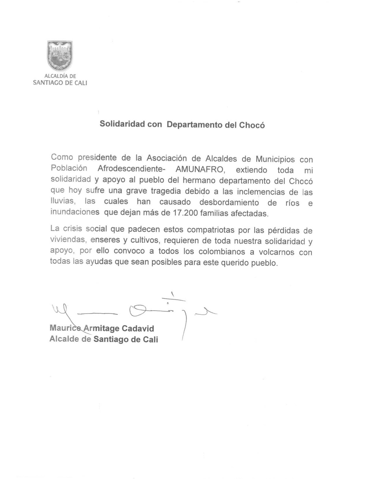 Ante los últimos acontecimientos en los que las lluvias dejan miles de afectados en el Departamento del Chocó, el Alcalde de Cali se solidariza con las víctimas e invitó a todos los colombianos a apoyar con ayudas a los damnificados.