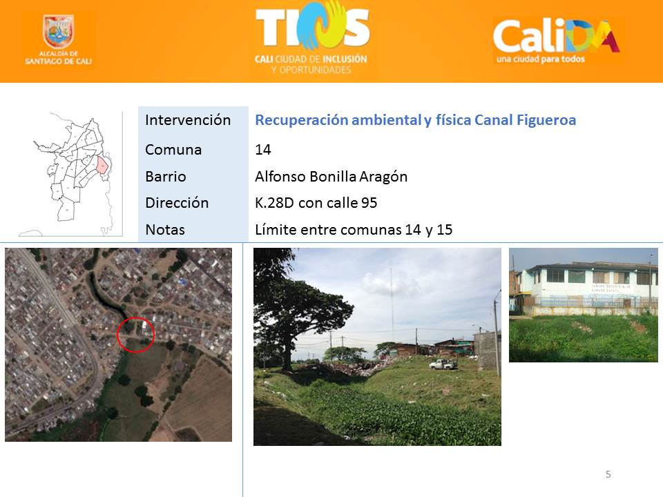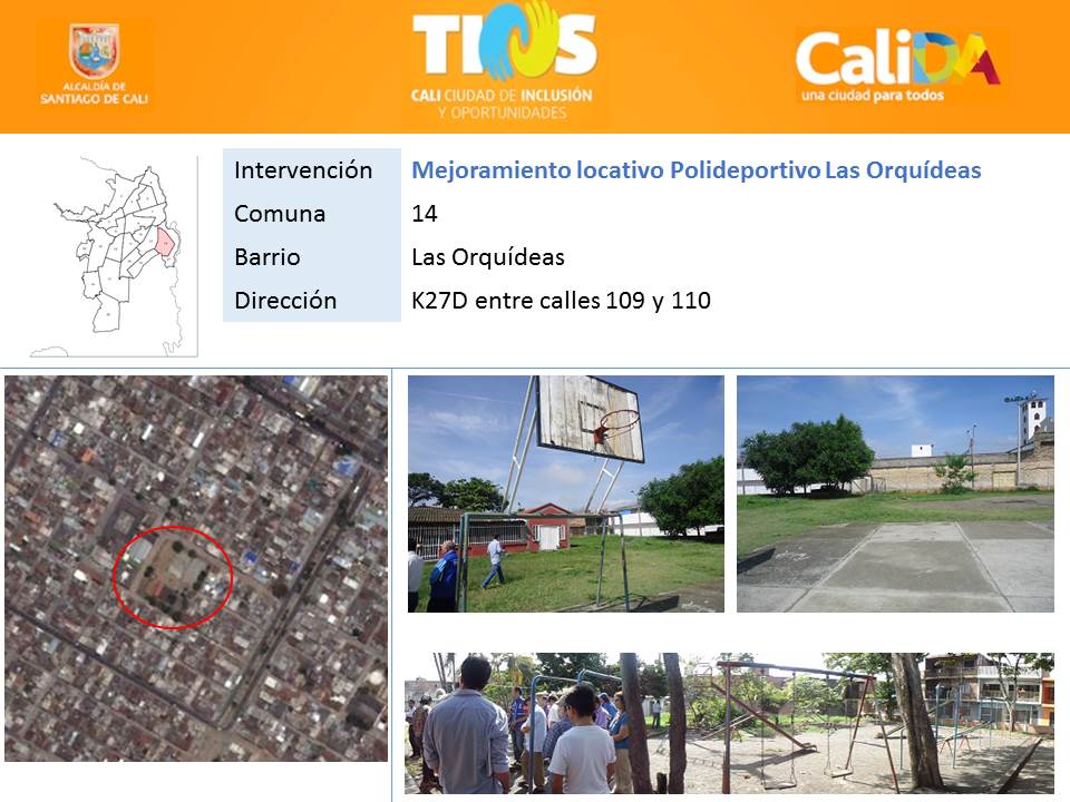 El mejoramiento locativo del polideportivo Las Orquídeas y el apoyo para la cooperativa de los jóvenes del mismo barrio; la recuperación ambiental y física del canal Figueroa y la adecuación del parque Gabriela Mistral, ambos en el barrio Alfonso Bonilla Aragón; sumado a la pavimentación de transitadas vías, forman parte del paquete priorizado por la estrategia TIOS.