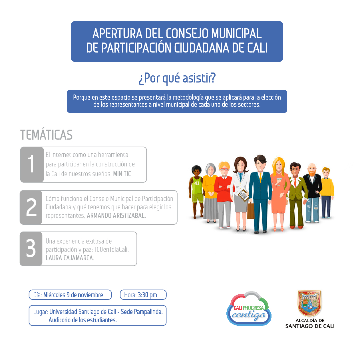 El Consejo Municipal de Participación Ciudadana es un espacio que abre la Alcaldía de Cali para seguir articulando las diferentes formas de incidir en la toma de decisiones de la Administración Municipal con una mirada desde la comunidad, y lo más importante, desde la pluralidad, ya que éste comité tendrá integrantes de todos los sectores comunitarios de la ciudad.
