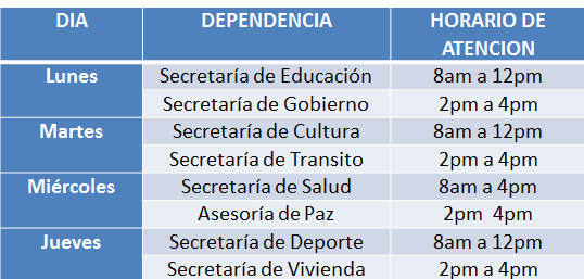 En el Centro de Atención al Adulto Mayor, cada dependencia hará presencia con un delegado diariamente, quien tendrá la tarea de atender las peticiones y requerimientos de acuerdo al cronograma adjunto.