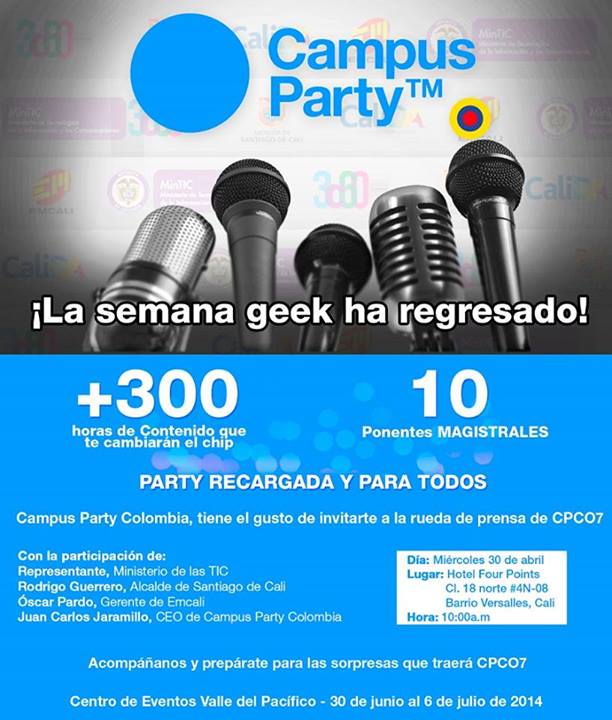 Campus Party invita a los medios de comunicación a una rueda de prensa que tendrá lugar este miércoles 30 de abril, a las 10:00 a.m., en el Hotel Fort Points.