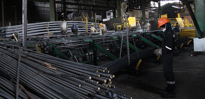 Este material fundido se convierte en una barra de aproximadamente 5 metros de largo, el cual es transportado por una serie de prensas que lo reducen y alargan hasta su punto máximo, terminando posteriormente en varillas, ángulos que suman diariamente una producción con un peso de producto terminado de unas 800.000 toneladas.