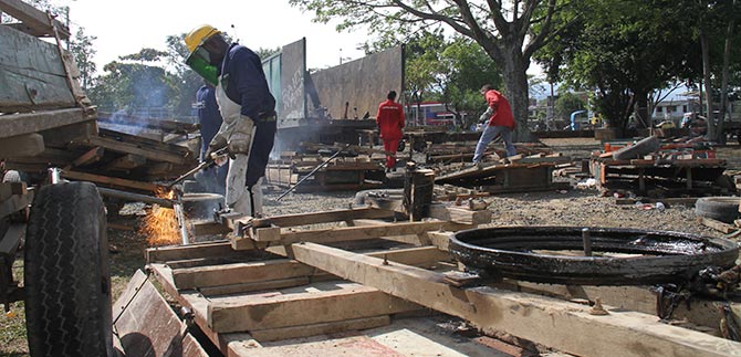 Luego de una jornada que incluye trabajo a punta de soplete, estos funcionarios separan el metal de la madera con el fin de cargar sus camiones con estas piezas metálicas, conocidas ya en este proceso como chatarra.