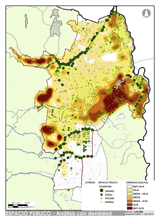 Figura 2. Densidad de población vs localización de Espacio Público. Población por manzanas fuente DANE 2005.