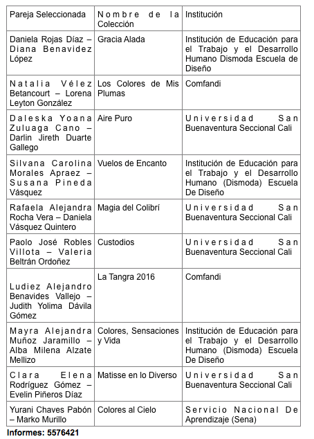De las parejas inscritas se seleccionaron las 10 mejores propuestas, estas han tenido la oportunidad de hacer parte de un proceso de formación con reconocidos diseñadores de la región y además de reconocimientos por su participación y premiación a las parejas que ocupen los tres primeros puestos en el cierre del concurso.