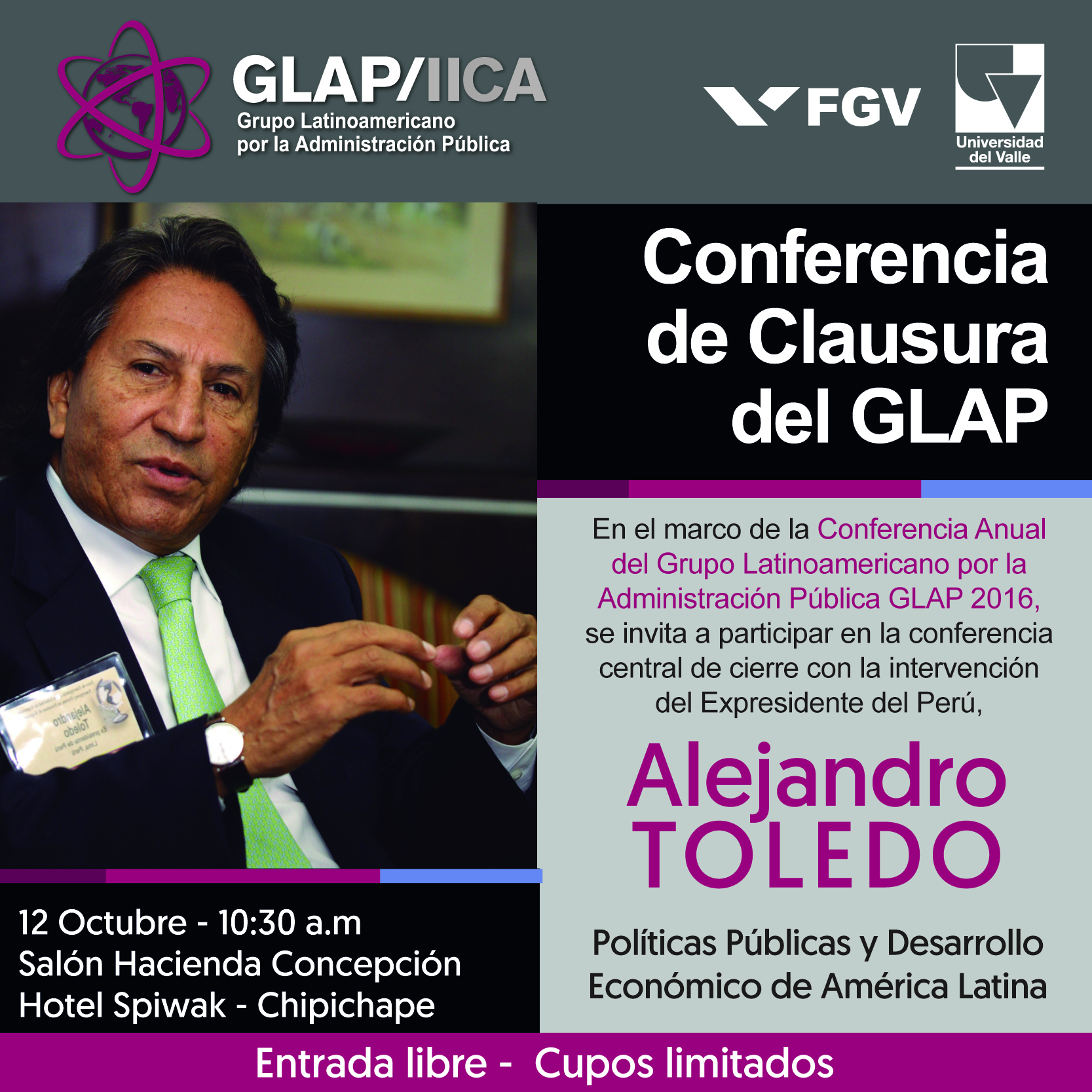 El ex Presidente de la República del Perú, Alejandro Toledo, visitará Santiago de Cali el 12 y 13 de octubre del presente año para dar cierre a la conferencia central del Grupo Latinoamericano por la Administración Pública-GLAP 2016 y para recibir el reconocimiento público como visitante ilustre por parte de la Universidad del Valle.