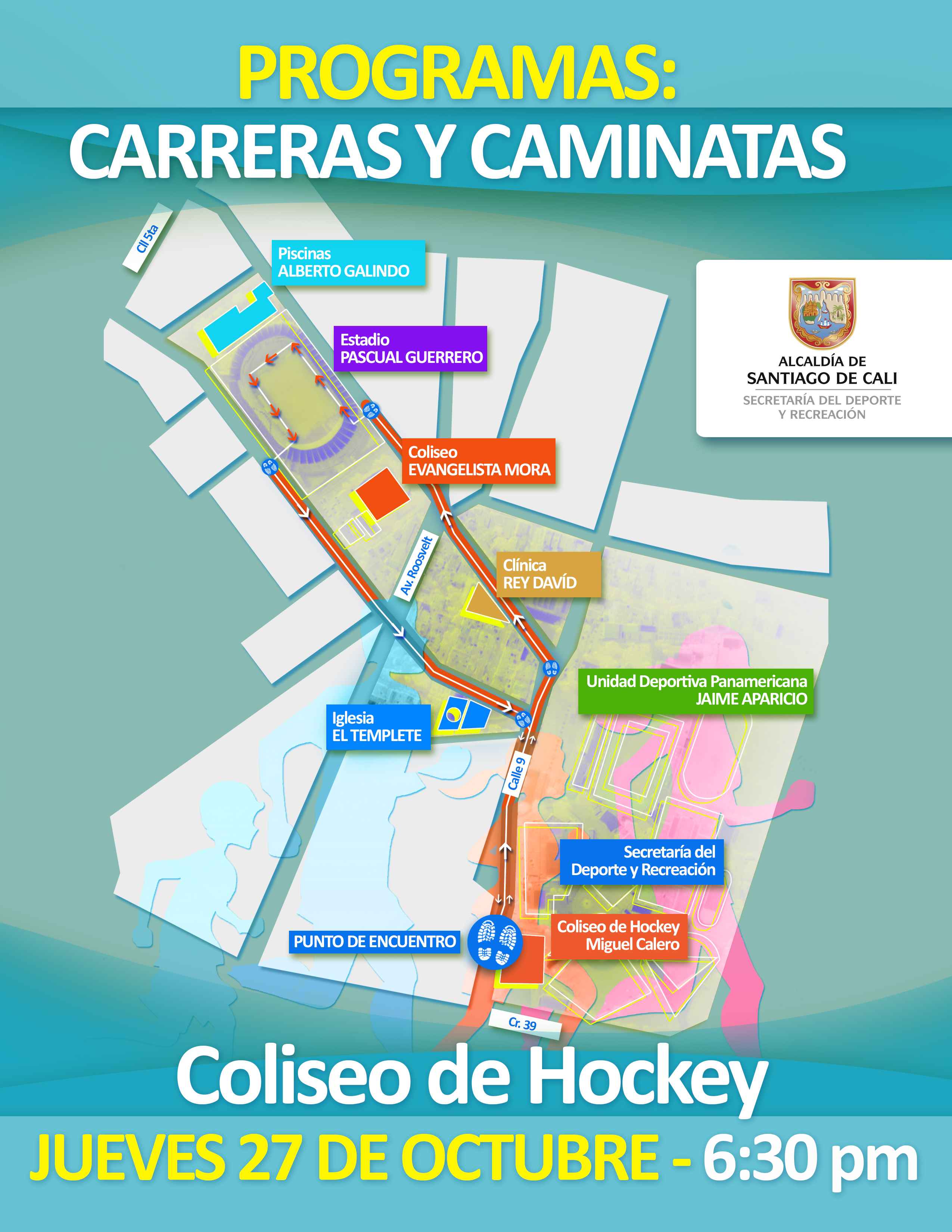 Este jueves 27 de octubre de 2016, a las 6:30 p.m., la Secretaría del Deporte y Recreación Municipal tiene el gusto de dar inicio a uno de sus programas: Carreras y Caminatas; con un recorrido a pie por espacio de 1 hora y 15 minutos, por algunos de los principales escenarios deportivos de alto rendimiento de Cali.